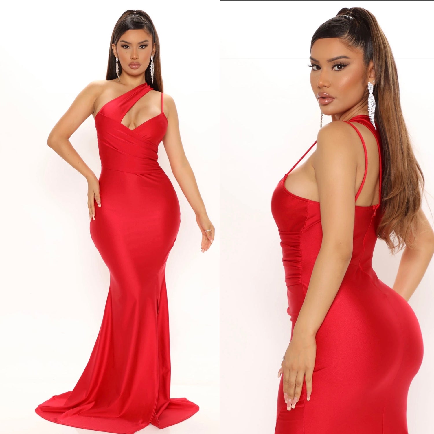 -Satin One Shoulder Cutout High Slit Evening Dress