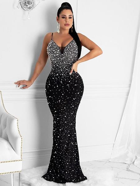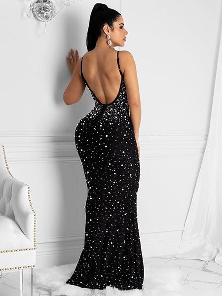 - Open Back Rhinestone Beading Party Gown Maxi Dress